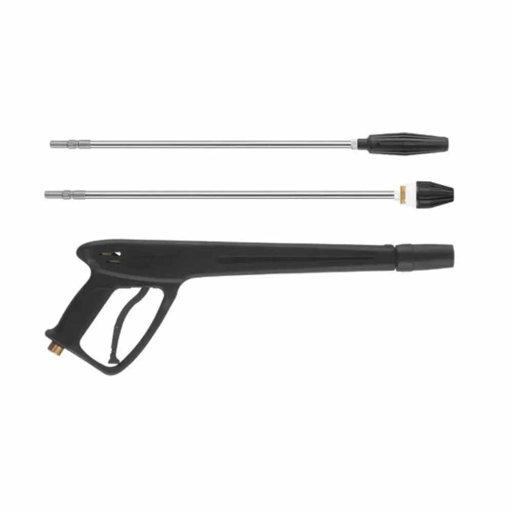 Os acesssórios, pistolas de alta pressão e lanças de limpeza, são arrumados de forma prática na lavadora.
