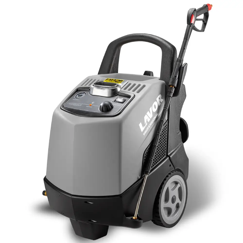 Lavadora de alta pressão a água quente, compacta, equipada com queimador vertical e serpentina em aço de elevada eficiência térmica, que reduz o consumo de gasóleo sem comprometer o desempenho de limpeza.