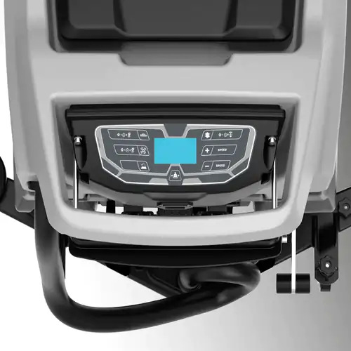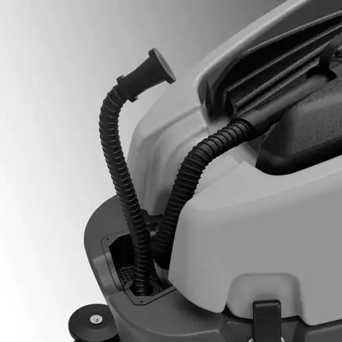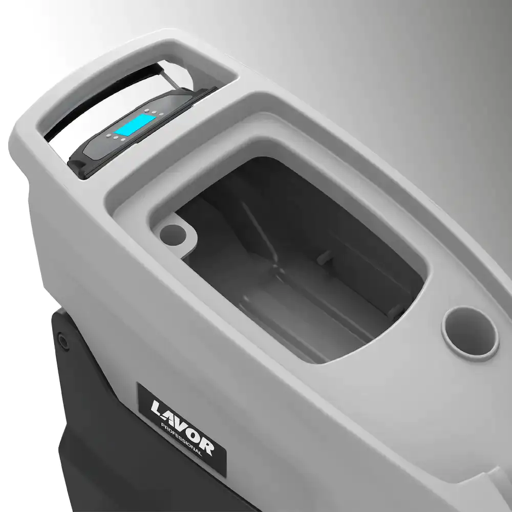 Esta Máquina destaca-se também pela construção robusta. Os depósitos são fabricados em polietileno rotomoldado resistente a choques e produtos químicos. A Lavadora inclui ainda um painel de controlo com sistema de segurança de presença do operador, indicador de bateria fraca, filtro de solução, acesso fácil ao compartimento das baterias e funcionamento silencioso graças à posição protegida do motor de aspiração.