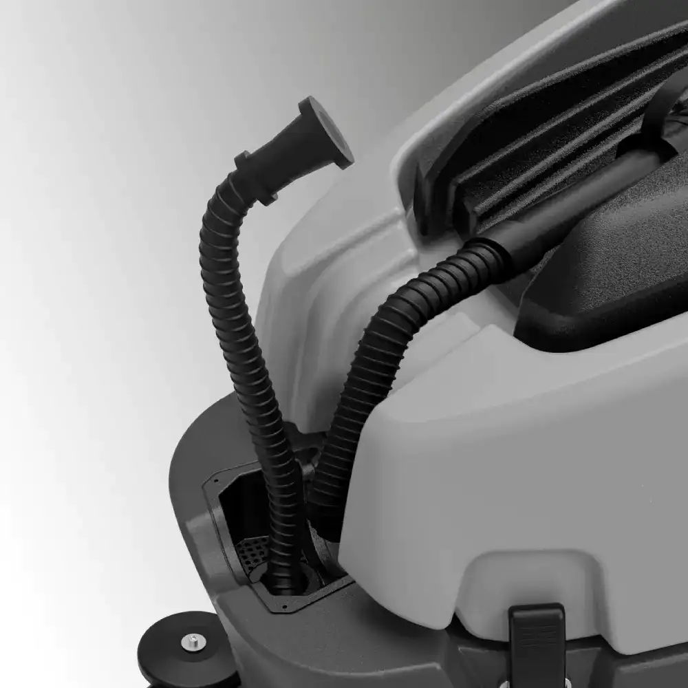 Equipada com alimentação a bateria de 24 V e sistema de tração automática, esta Lavadora facilita o deslocamento durante a operação. A máquina integra também um potente sistema de aspiração com motor 2 x 400 W, o que garante uma recolha eficaz da água suja e deixa o pavimento praticamente seco após a passagem.