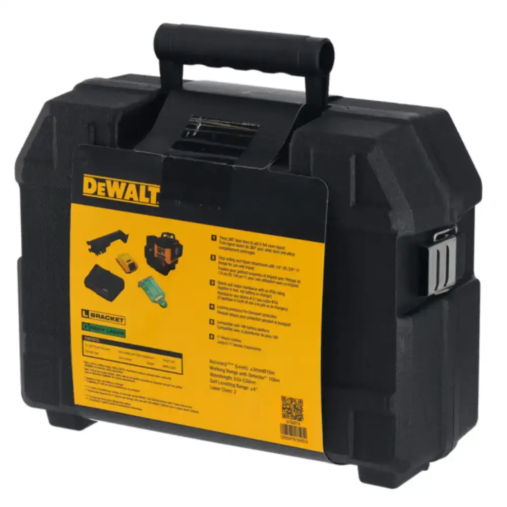 Este Medidor Laser Autonivelante Verde de 3 Linhas 360º da Dewalt é uma ferramenta profissional ideal para nivelamento e alinhamento em diversos ambientes.