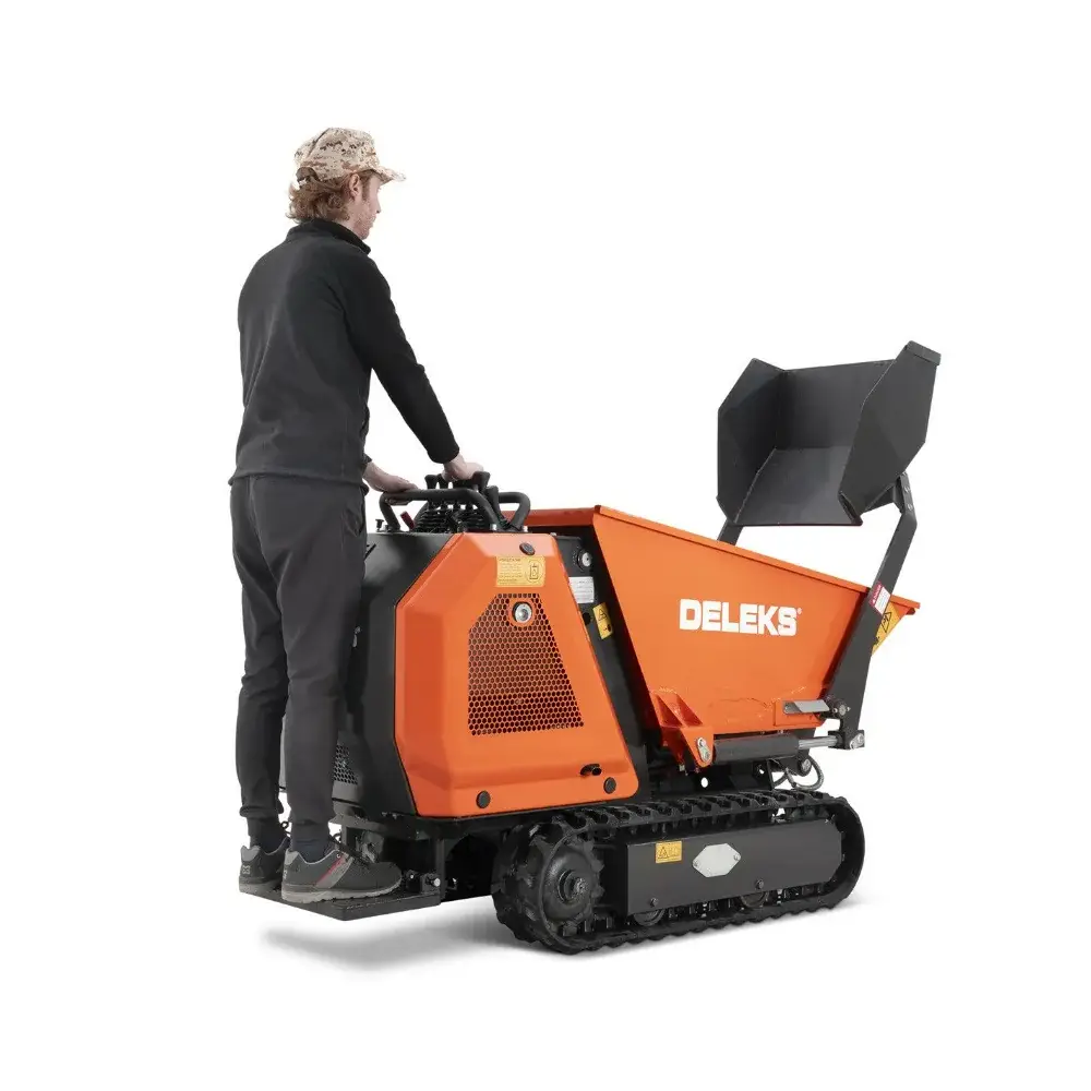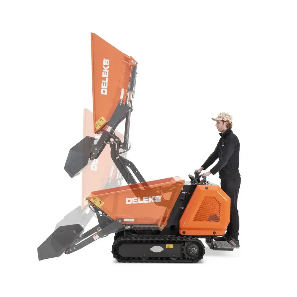 O Dumper Agrícola Deleks com Lagartas e Elevação Hidráulica + Basculamento é a solução ideal para enfrentar os desafios do trabalho agrícola e de construção em terrenos acidentados.