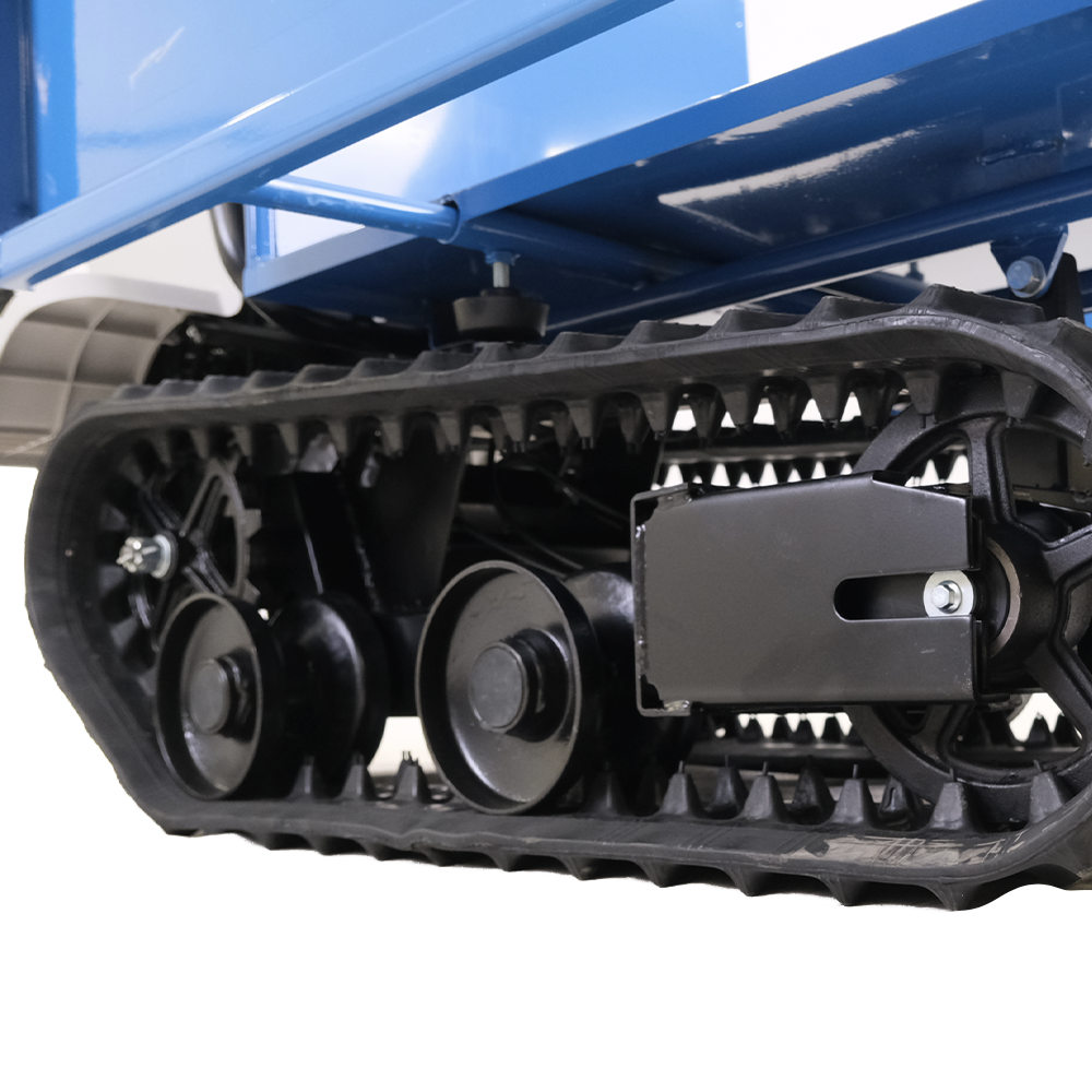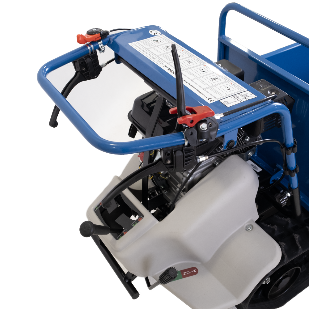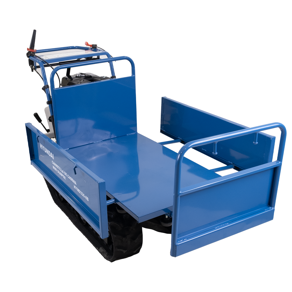Mini Dumper Lagartas Hyundai 330 com confiável e reputado motor Hyundai de 6.5HP 198cc e caixa de carga basculante com capacidade de 330kg.