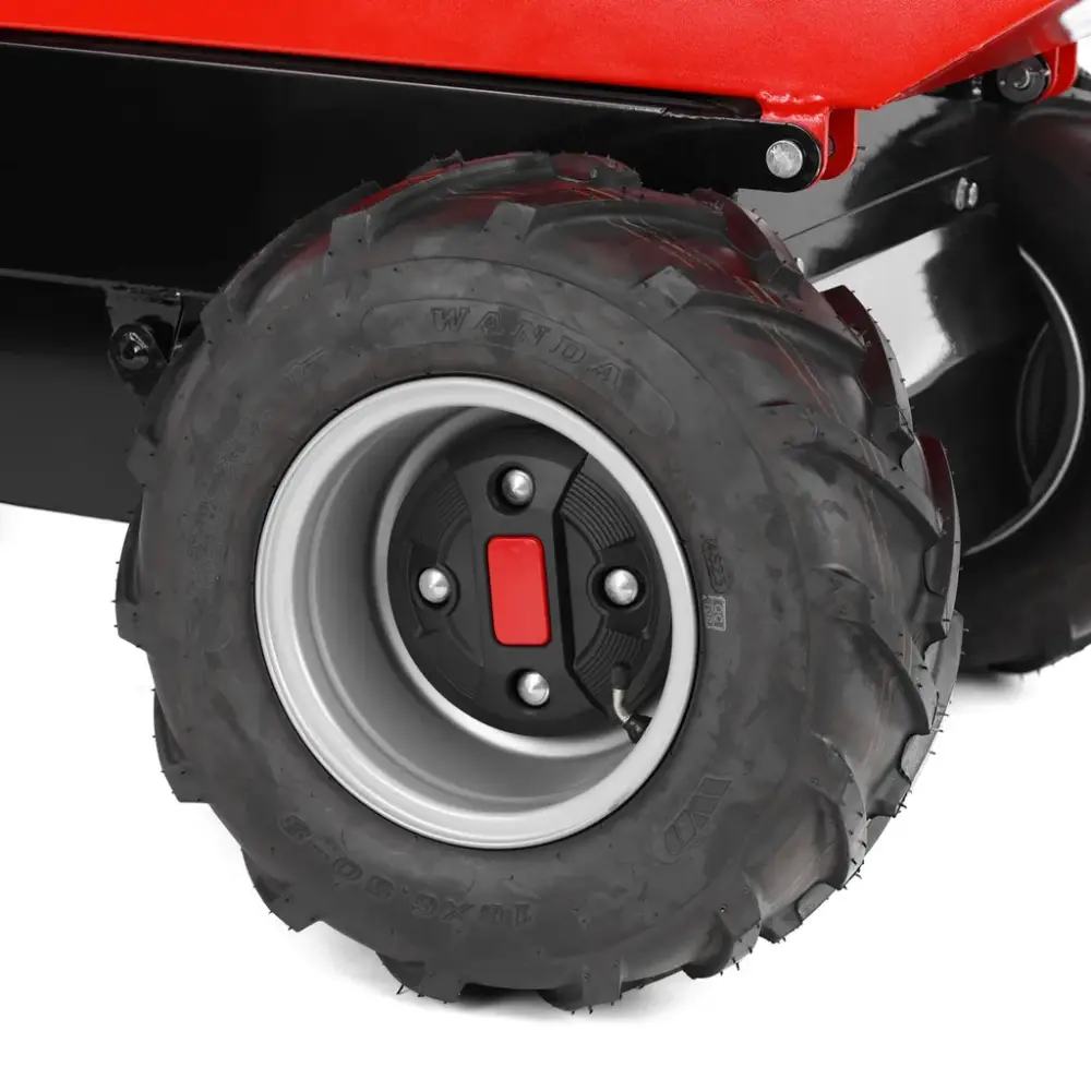 A tração e os pneus robustos fazem com que o mini dumper Hecht 2625 mantenha a aderência e a estabilidade mesmo em terrenos irregulares ou inclinados, suportando subidas até 12º.