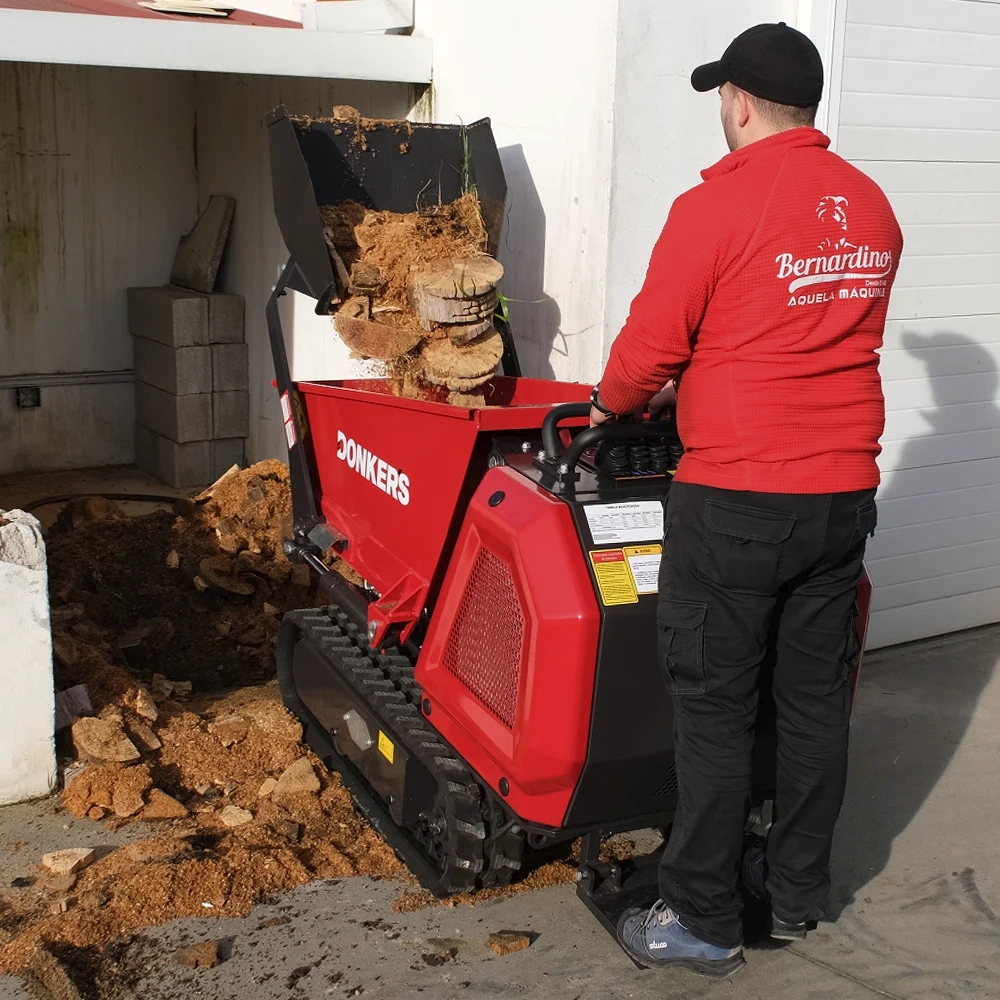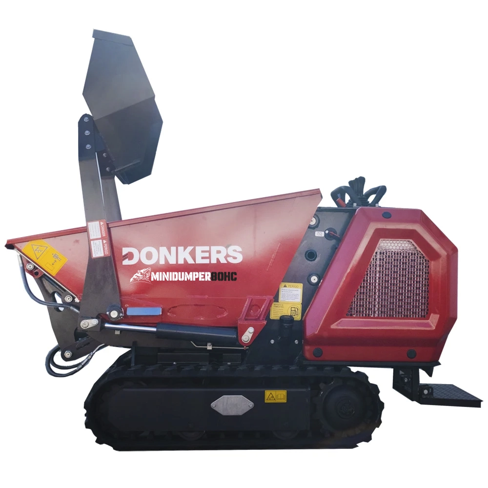 Compacto, versátil e potente, o Mini Dumper de Lagartas Donker´s MD80HC está equipado com um motor potente a gasolina de 13.7Hp, sistema de caixa hidráulica basculante, pá carregadora integrada e plataforma para o utilizador.
