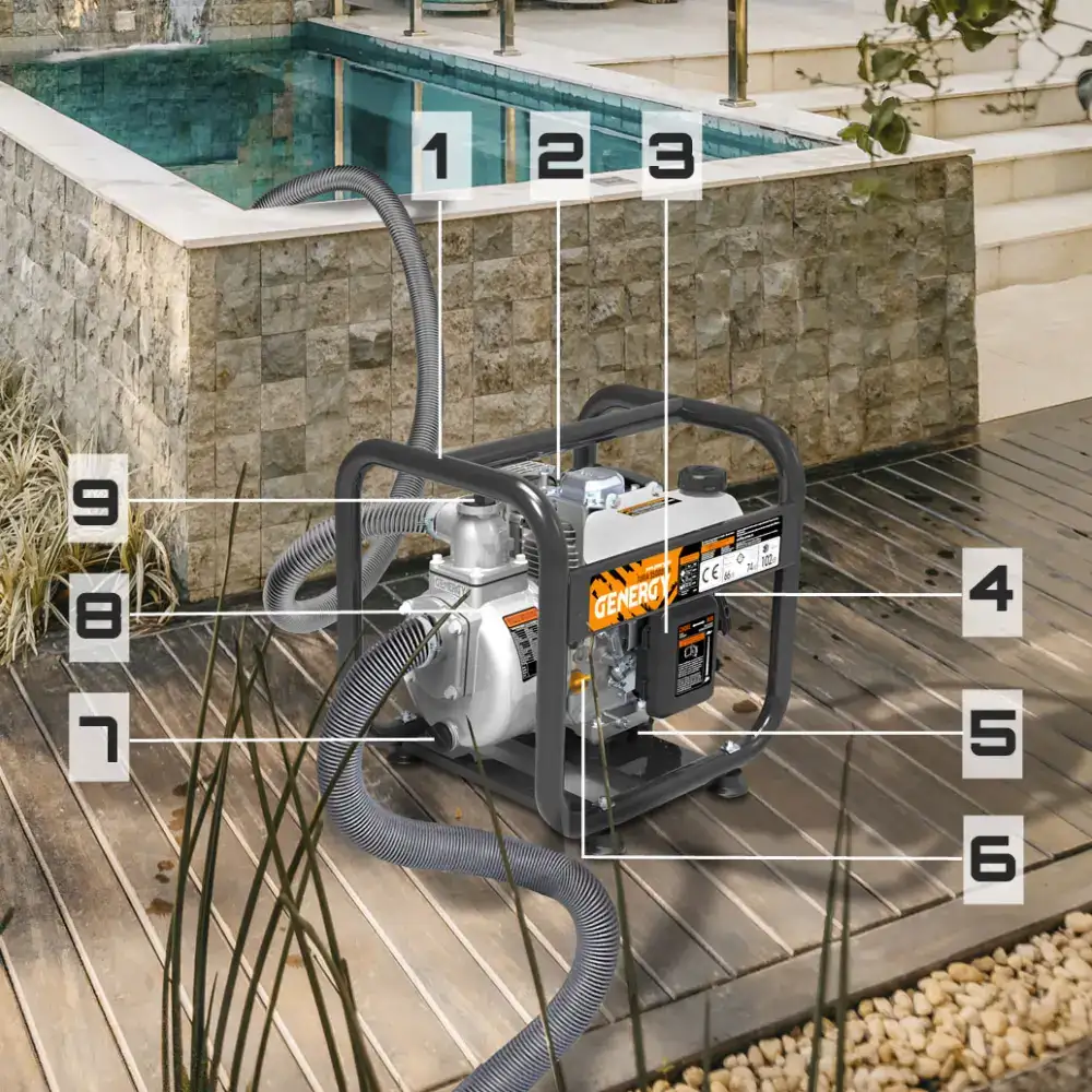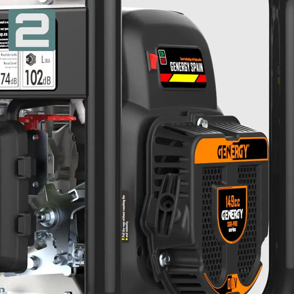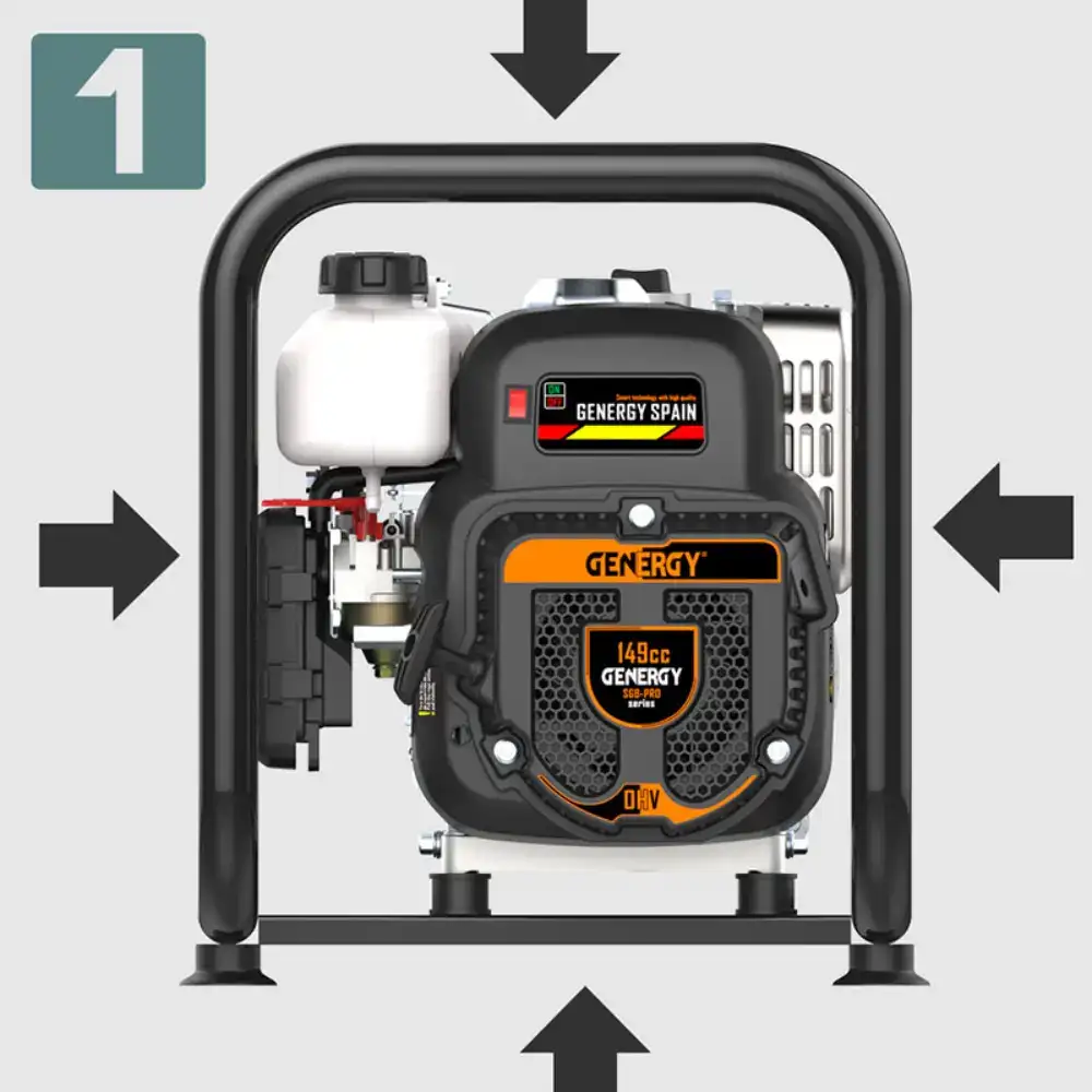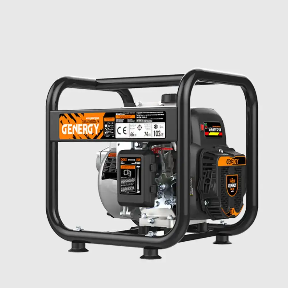 A Motobomba Genergy Turia é fácil de transportar graças à sua estrutura compacta e pega integrada, permitindo a deslocação para diferentes pontos de utilização com mínimo esforço. É a escolha perfeita para profissionais e particulares que procuram desempenho, robustez e fiabilidade num equipamento de bombeamento portátil.