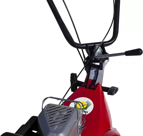 O guiador também é ajustável em altura e lateralmente para uma posição de trabalho confortável. A transmissão central é feita por corrente em banho de óleo enquanto a lateral é por correia, protegida por um cárter facilmente removível em caso de manutenção. A roda de de apoio ao transporte, está é posicionada lateralmente durante as operações de trabalho. Ele levanta-se com um simples gesto de mão e permanece preso à máquina sem criar volume. (Não são necessárias ferramentas)