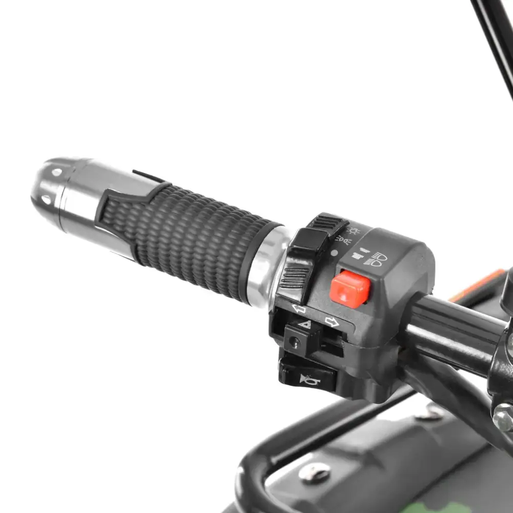 No lado esquerdo encontra-se o controle padrão de luzes, piscas e buzina. No lado direito tem um botão que ativa a marcha atrás.