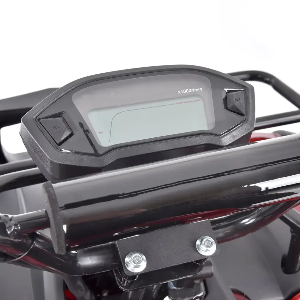 A parte superior do farol é dominada por um painel digital que exibe claramente todas as informações necessárias, como velocidade, quilometragem, luzes indicadoras ou a quantidade de carga da bateria.
