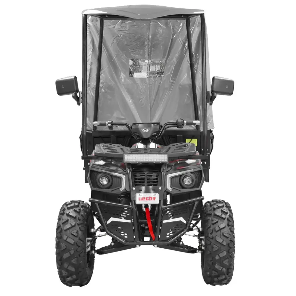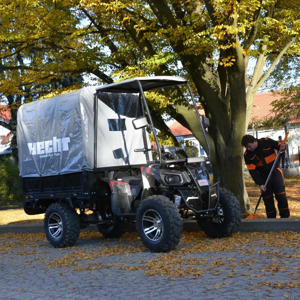 A moto 4 elétrica Hecht Cargo está equipada com uma caixa de carga basculante coberta, iluminação LED, travões de disco nas 4 rodas, guincho de reboque.