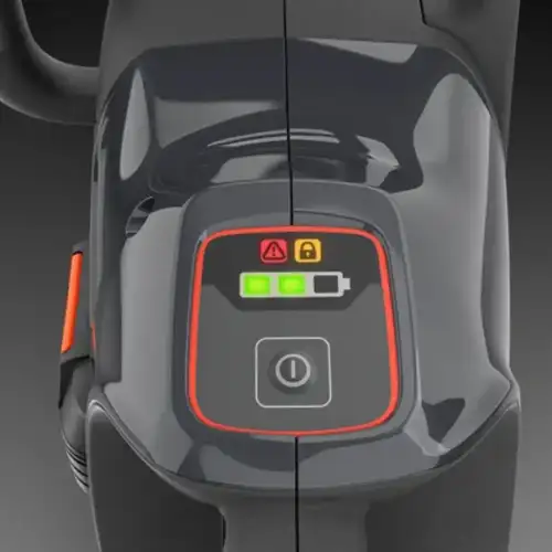 Graças à interface de utilizador digital inteligente, pode ligar e desligar o motor com apenas um toque de botão e visualizar facilmente o estado da bateria, o travão de corrente ativado e outras indicações. Equipada com pontos de interação laranja orientadores e desligamento automático se não for utilizado durante 180 segundos, reduzindo o risco de lesões e prolongando a vida útil da bateria.