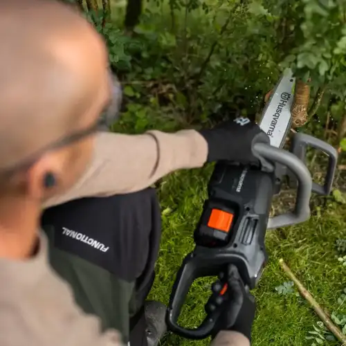 Esta Motosserra Husqvarna Aspire™ alimentada por bateria está otimizada para poda, limpeza de jardins, pequenos cortes de árvores e projetos de bricolage.