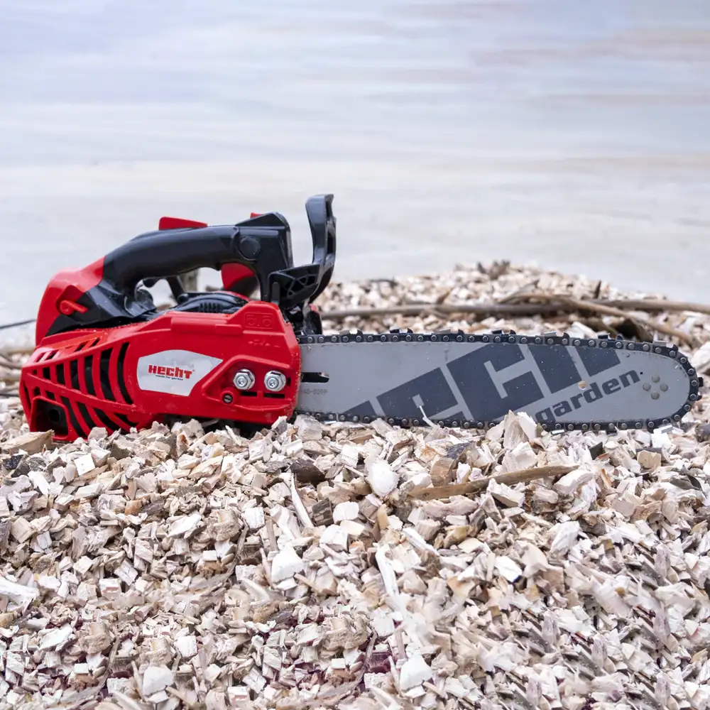 A motosserra é equipada com uma barra Hecht de alta qualidade, com comprimento de 30 cm, e uma corrente de 3/8" e 1,3 mm.