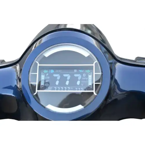 El panel digital integrado en la parte superior del faro delantero muestra claramente toda la información esencial, como la velocidad, el kilometraje y el nivel de carga.