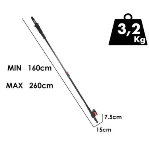 Equipada com uma lâmina de cerca de 20 cm, permite cortar ramos até 18 cm de diâmetro. O comprimento telescópico ajustável, entre 2,1 m e 2,6 m, possibilita alcançar ramos elevados a partir do solo, com segurança e conforto.