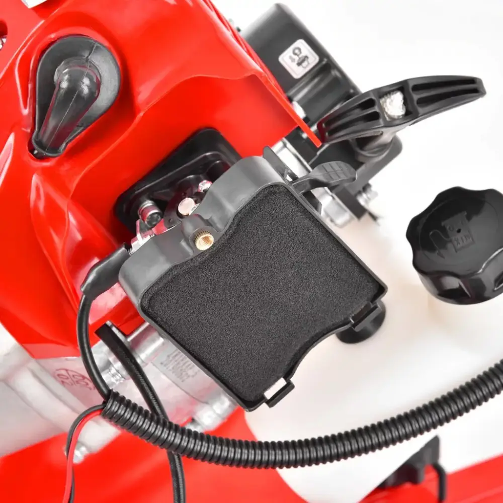 La rueda auxiliar trasera ajustable permite orientar el cabezal de corte con mayor precisión, incluso cerca del suelo. La potencia proviene de un motor de gasolina de dos tiempos con una cilindrada de 52 cc y una potencia de 1,5 kW (2 CV).