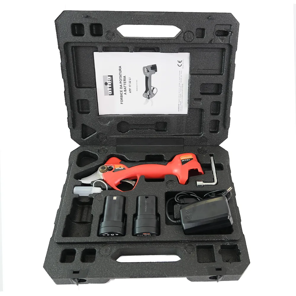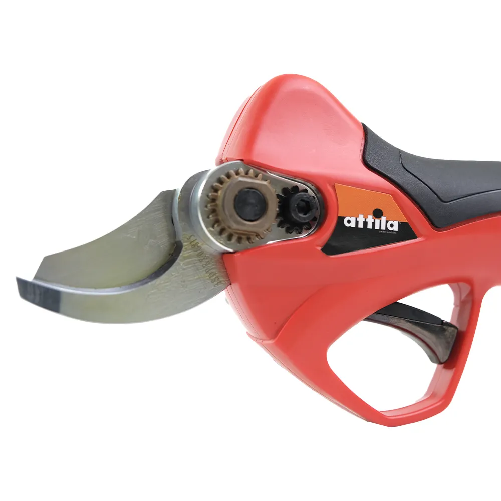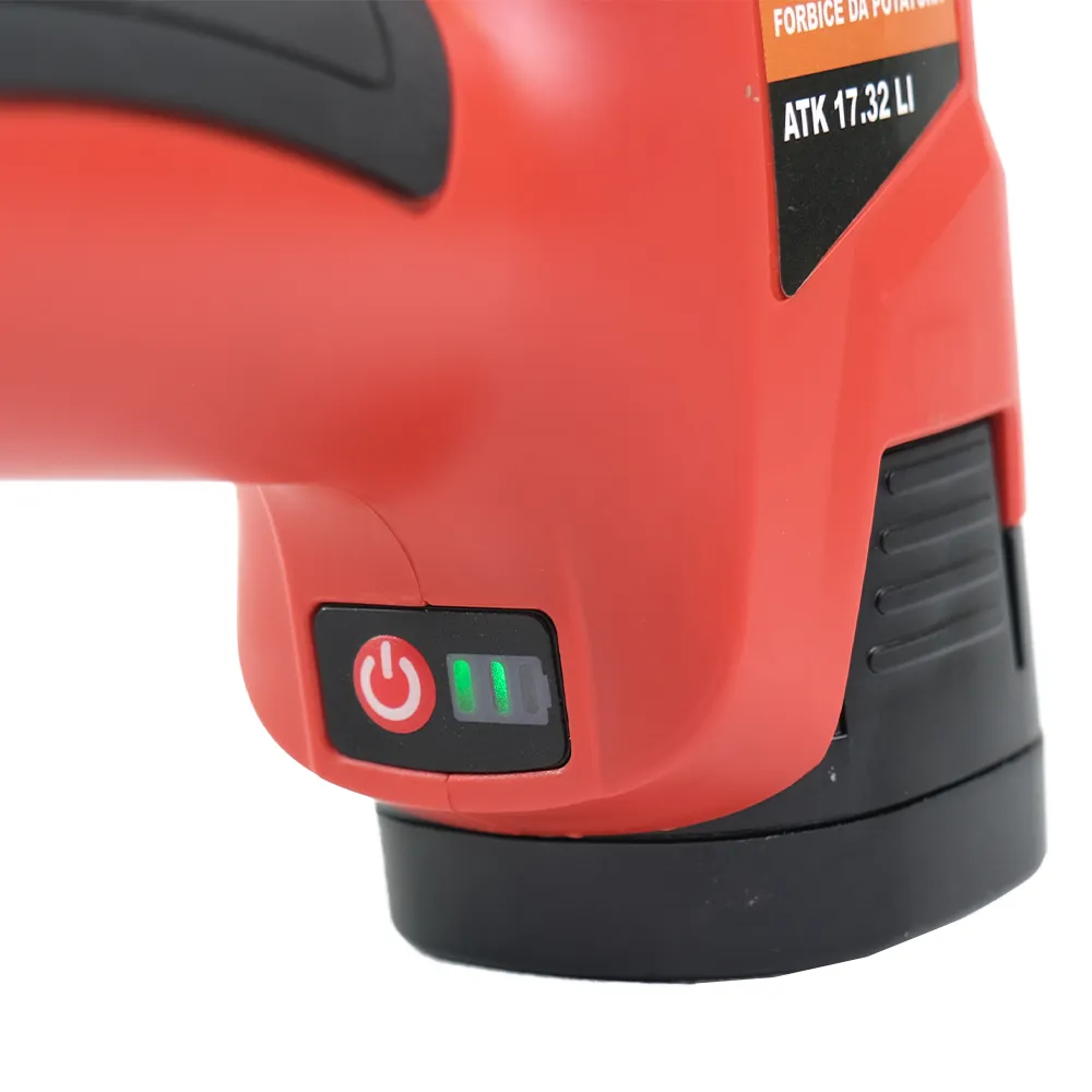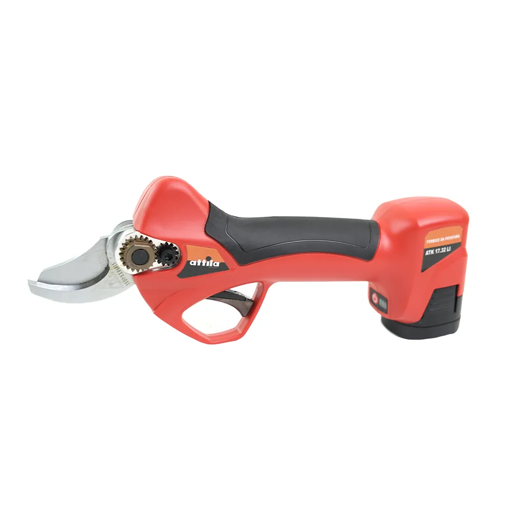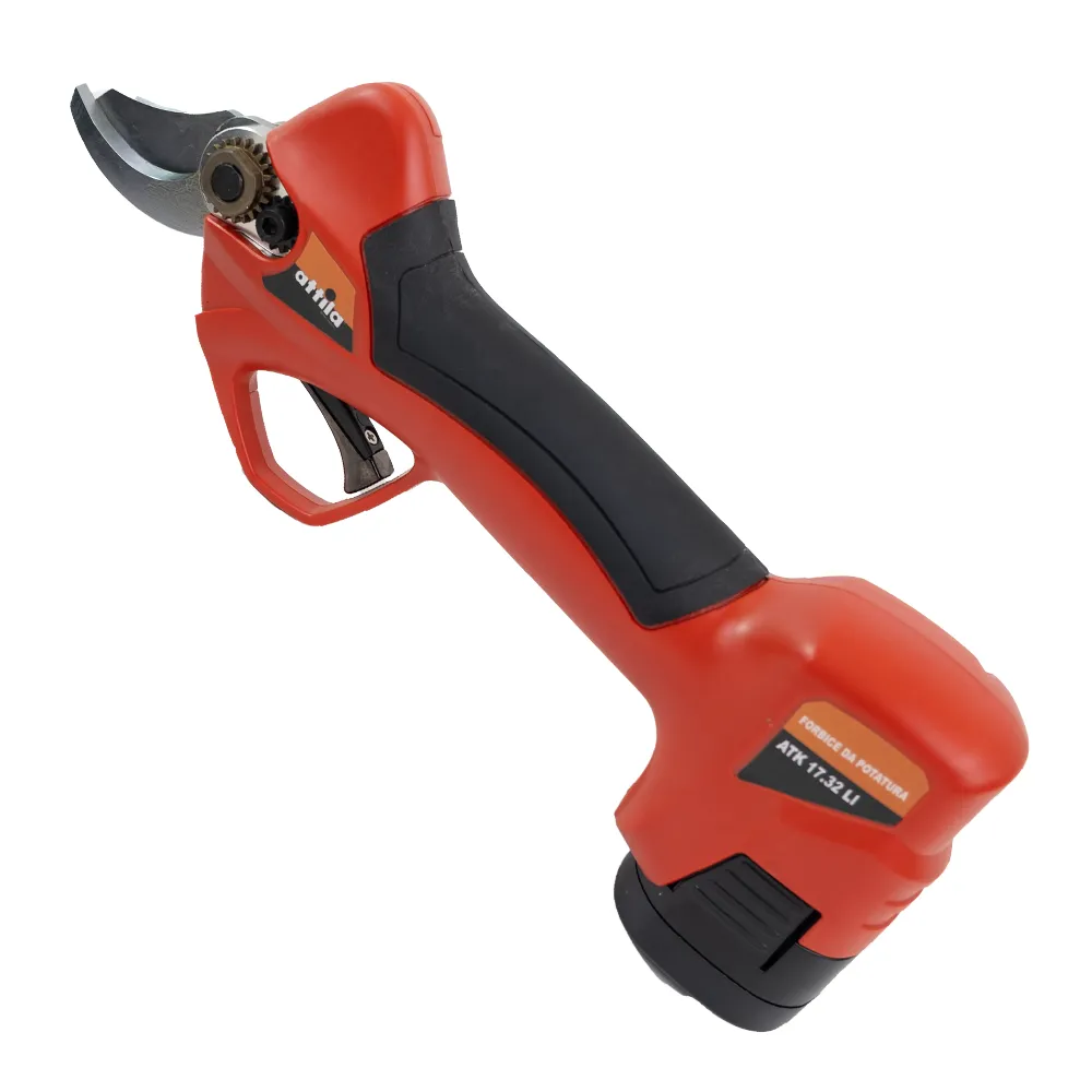 La tijera de podar a batería Attila ATF, modelo 17.32, con sistema de corte progresivo, permite podar ramas de hasta 32 mm de grosor, ya sean de árboles, zarzas, sarmientos, rosales y arbustos en general. Esta tijera de alta calidad, fabricada en Italia, garantiza cortes precisos, rápidos y eficaces, realizados con destreza y rapidez. Su forma ergonómica y equilibrada permite sujetar la tijera fácilmente sin fatiga excesiva, incluso después de largas sesiones de trabajo, gracias a su mango ergonómico de goma Soft Touch. Las hojas de alta calidad confieren a estas tijeras una potencia y dureza especiales, además de durabilidad y resistencia a daños accidentales.