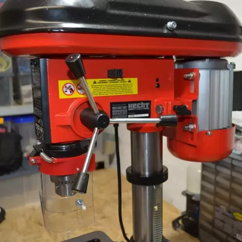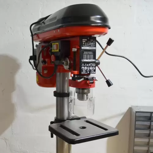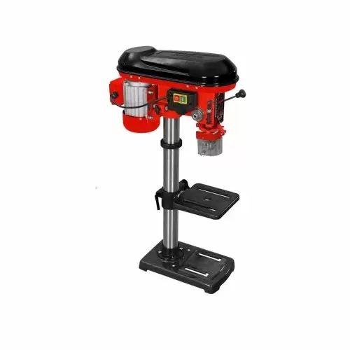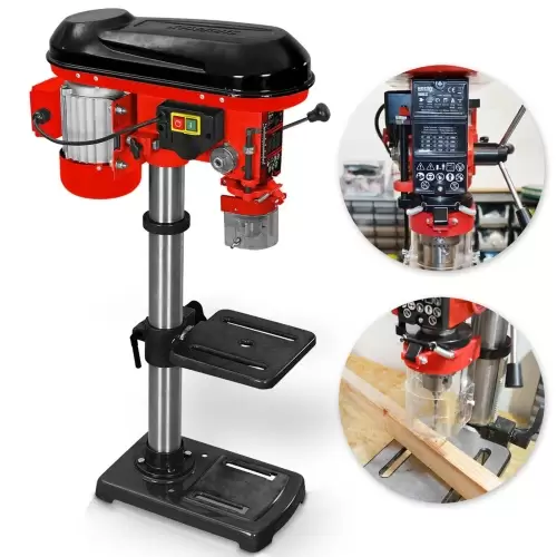600W Column Drill - Drill driven by a V-belt and a 600W motor. Designed for precise drilling of holes in materials such as: metal, wood, stone, plastics, non-ferrous metals, light metals, structural steels, cast iron and many others. It is equipped with a 12-step speed control in the range of 420-2700 rpm. The work table allows rotation up to 360° by means of a rotating pin. The gearbox is made of solid cast metal for a long service life. The heavy-duty 16 mm chuck can handle drilling with larger drill bits. The spindle guard increases operator safety. Shipping features: For safety reasons, the equipment is shipped in its original box, partially assembled, accompanied by all accessories.