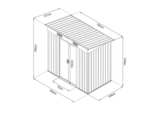 Tiene un suelo de 1090 x 1840 mm (dimensiones externas de la base), lo que permite almacenar herramientas, equipos de jardinería y otros materiales que deban mantenerse secos y protegidos. Las dimensiones, incluyendo el alero, son de 1210 x 1950 mm.