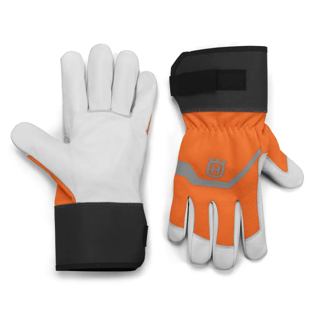Guantes Husqvarna fabricados en cuero de alta resistencia para trabajos exigentes, dorso de tejido spandex para mayor comodidad y puño de goma con cierre de velcro para un ajuste perfecto.