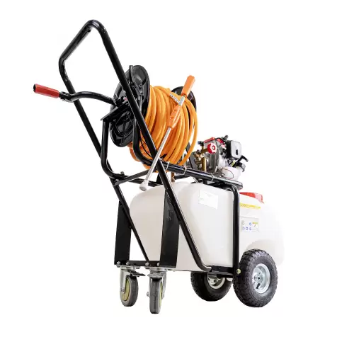 Este pulverizador vem montado num carro de mão cómodo com quatro rodas, o que permite o fácil transporte e poupa imenso tempo e esforço ao utilizador.