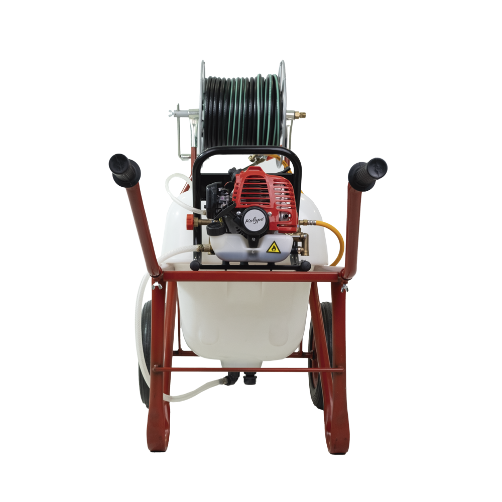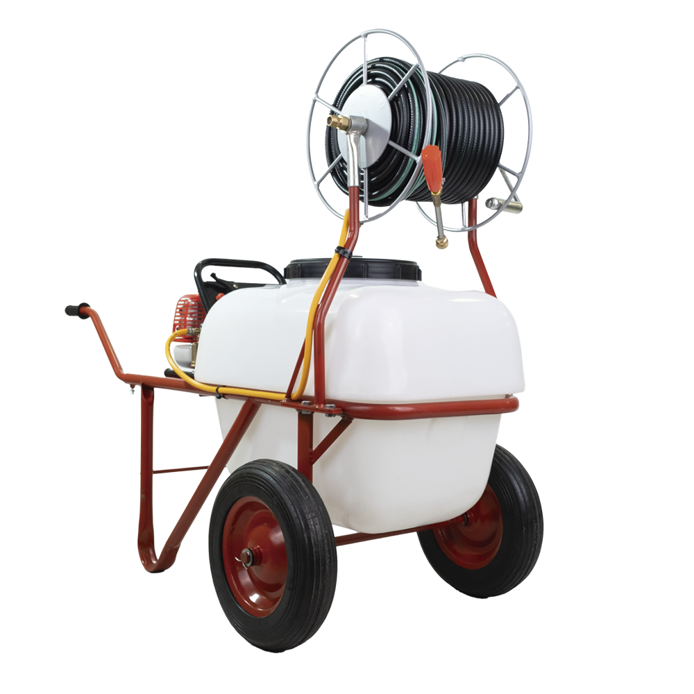 O pulverizador de carrinho está  equipado com um enrolador e uma mangueira de 50 metros, que garante um alcance amplo e eficaz, ideal para tratar grandes áreas de forma prática.