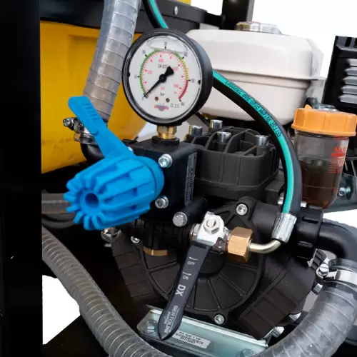 Pulverizador Rebocável Donker’s 200L equipado com bomba Bertollini de fiabilidade mundialmente reconhecida que confere o caudal de 40 L/min.