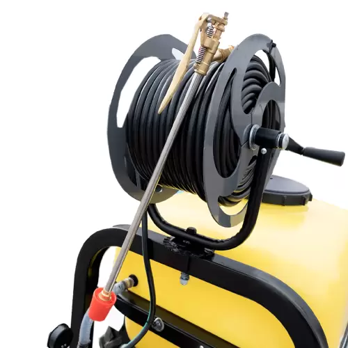 Pulverizador de Estrado Donker’s 200L com enrolador de mangueira para organização correta e transporte facilitado da mesma. A mangueira tem 50M de comprimento e pode auxiliar no combate a incêndios.