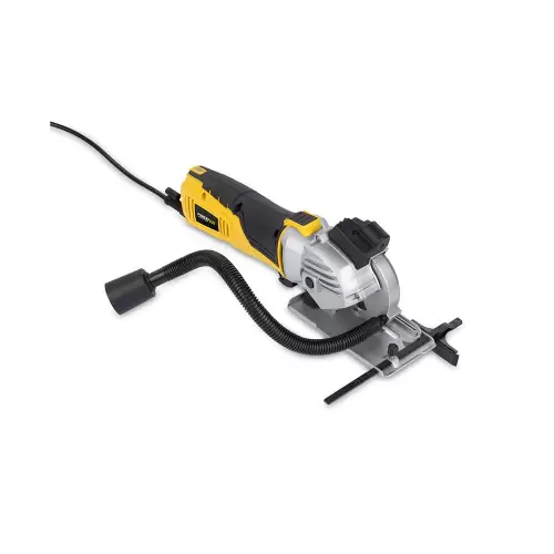 Guia lateral para um corte perfeito e limpo. Possui trava de eixo e chave hexagonal para trocas rápidas de lâmina e um grampo rápido para ajuste de profundidade. A profundidade máxima de corte é de 28,5 mm.