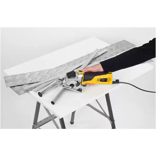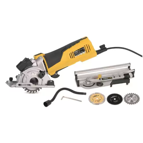 Vem com uma caixa de esquadria para guiar a serra para cortes angulares precisos e é fornecida com 3 lâminas de serra (TCT, HSS e diamante) e um adaptador de extração de poeira para conexão a um aspirador doméstico. O benefício da extração de poeira é uma visão clara da linha de corte, um ambiente de trabalho limpo e um ar sem serragem.