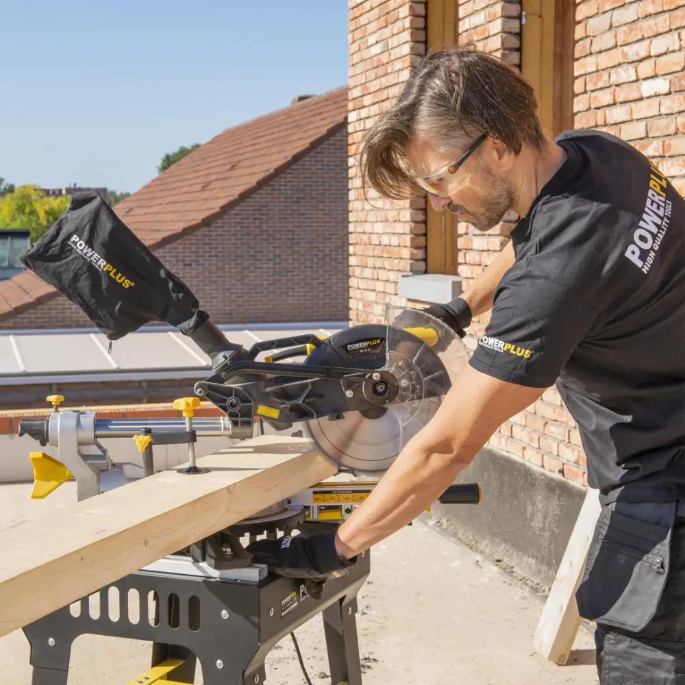 A escala horizontal e vertical integrada permite ajustes precisos no ângulo de corte, e os acessórios de suporte, como os guias laterais e a braçadeira ajustável, mantêm a peça de trabalho firme no lugar, assegurando cortes uniformes e de alta precisão.