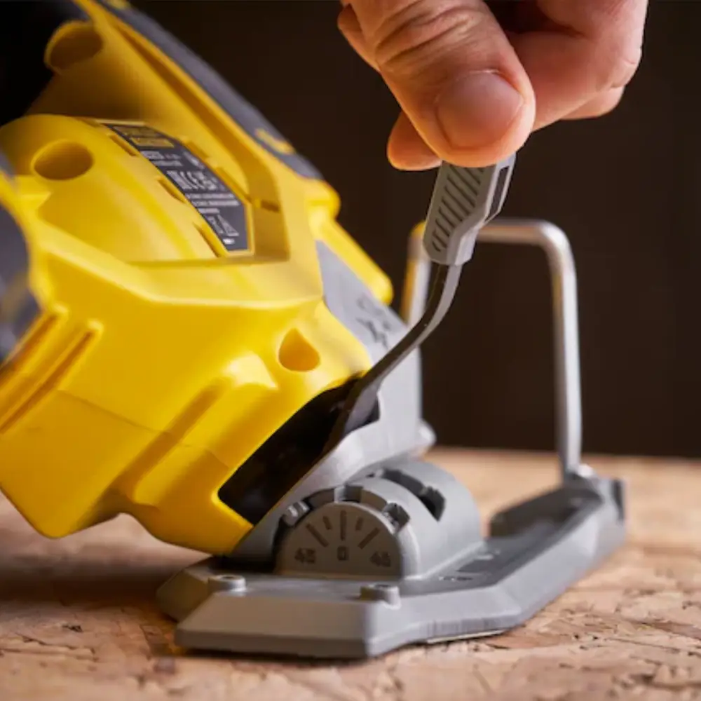 O sistema de fixação da lâmina sem necessidade de ferramentas facilita a substituição rápida e segura das lâminas, enquanto a base ajustável permite cortes em ângulo (até 45°), ideal para aplicações de encaixe ou acabamentos decorativos. O soprador de pó integrado mantém a linha de corte limpa e visível, aumentando a precisão do trabalho.