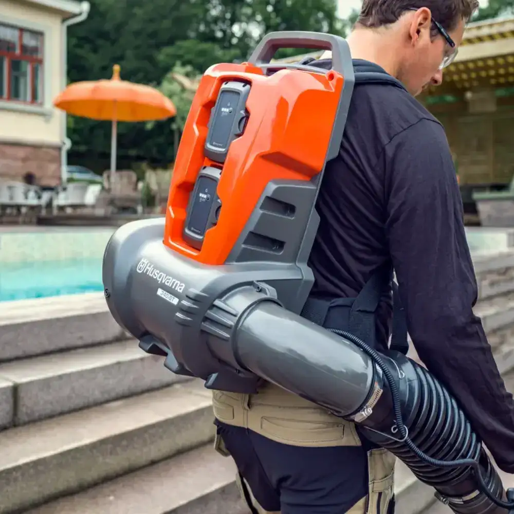 Husqvarna 340iBT 36V Battery Backpack Blower with space for 2 batteries, powerful 17N blowing force and adjustable side-shift handle.