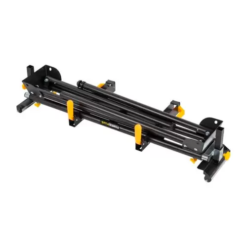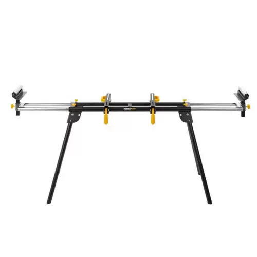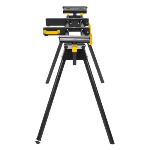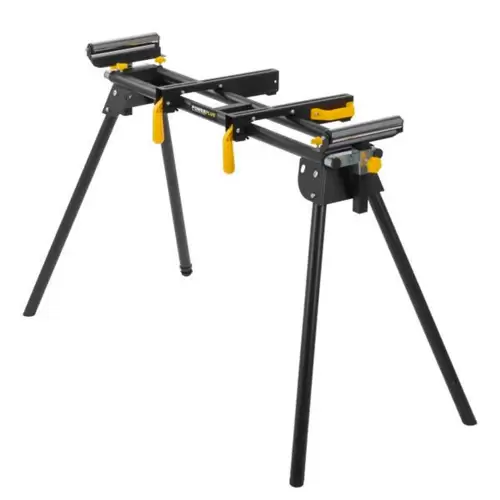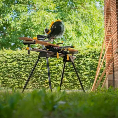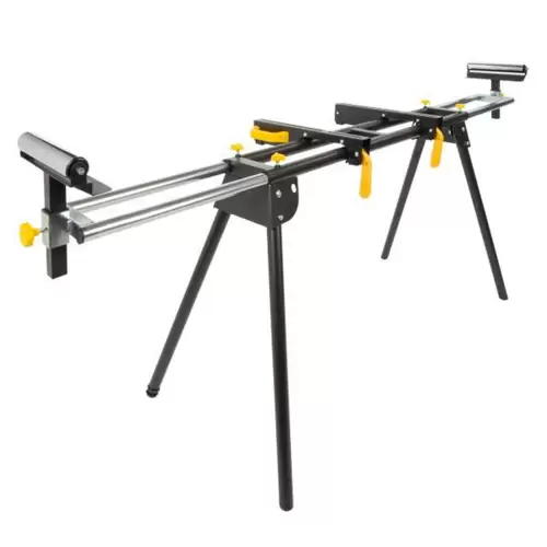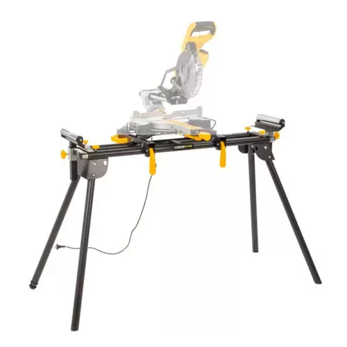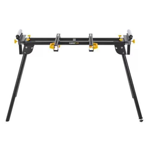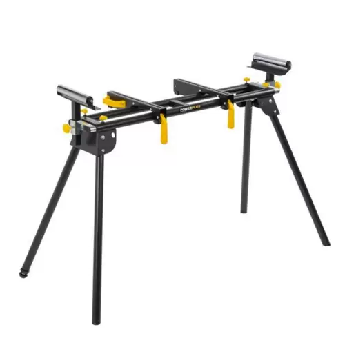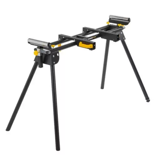 Soporte para sierra ingletadora PowerPlus ajustable en altura y con 2 rodillos en los extremos para asegurar las sierras ingletadoras y ayudar en el manejo eficiente de piezas largas.