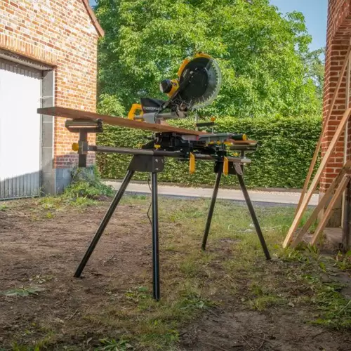 Corte tablas más largas sin problemas. Los soportes de rodillos en los extremos son ajustables en altura y anchura, adaptándose perfectamente a la altura de la sierra ingletadora y la pieza de trabajo.