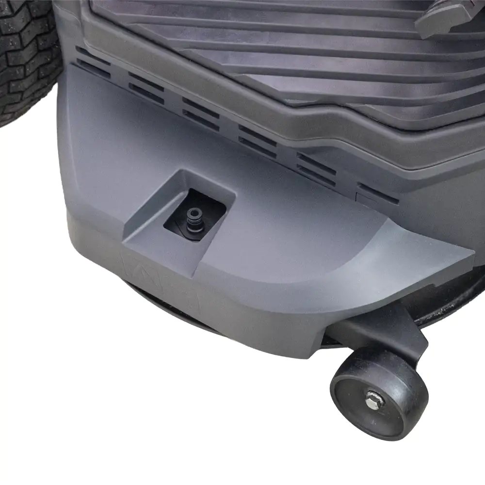 O cesto de recolha de 280 L garante uma recolha eficiente e de fácil descarga, enquanto que o conector para lavagem da unidade de corte facilita a limpeza e a manutenção do equipamento.