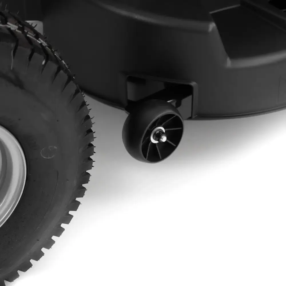 A largura de corte de 98 cm permite uma cobertura de área generosa em cada passagem, enquanto o sistema de corte com duas lâminas rotativas e uma roda que garante estabilidade das mesmas no corte, asseguram um acabamento limpo e uniforme.