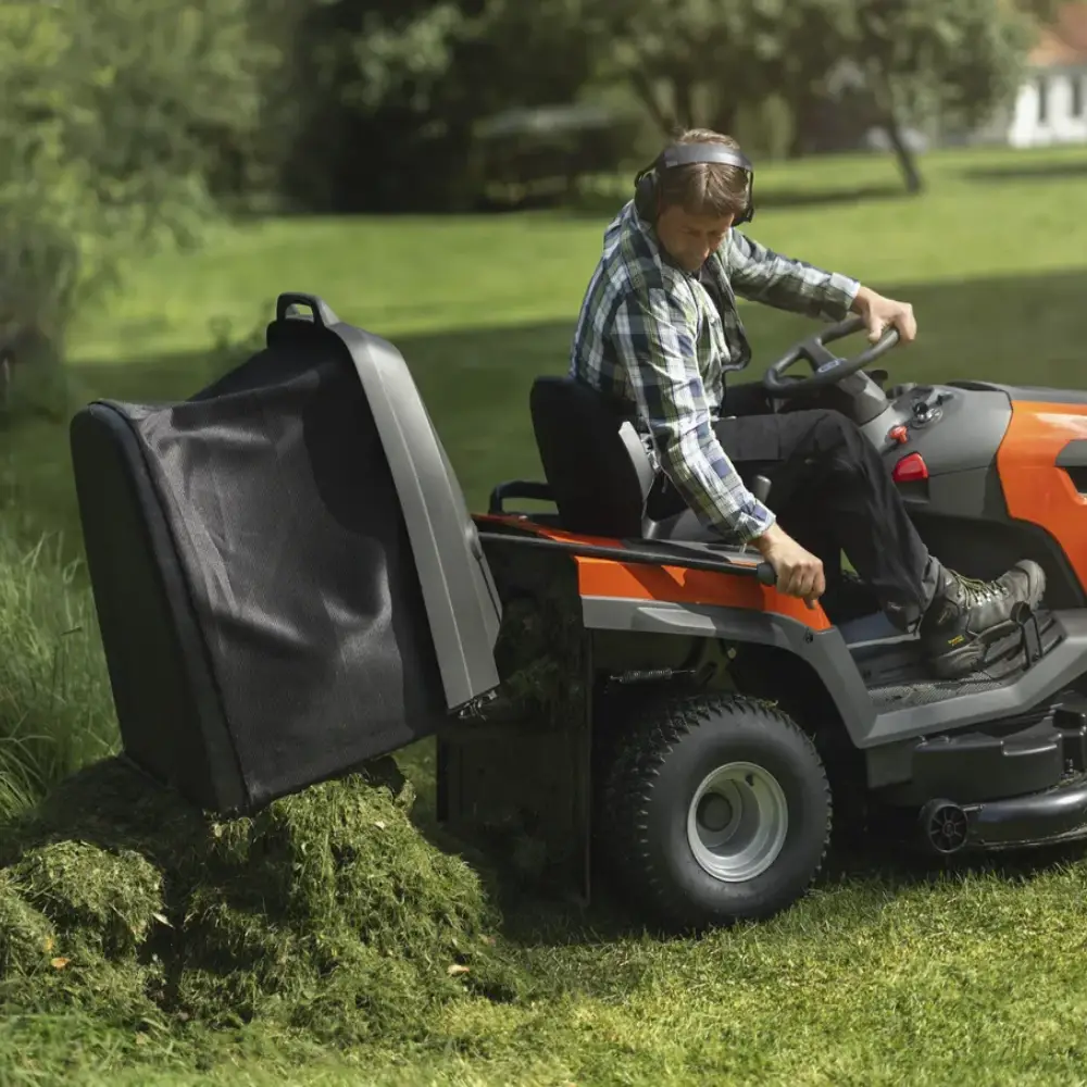 O sistema de corte com recolha traseira integrada permite recolher eficientemente os resíduos de relva, deixando o jardim limpo e bem cuidado. O generoso cesto de recolha (com capacidade aproximada de 320 litros) pode ser facilmente esvaziado a partir do assento, sem necessidade de sair da máquina.