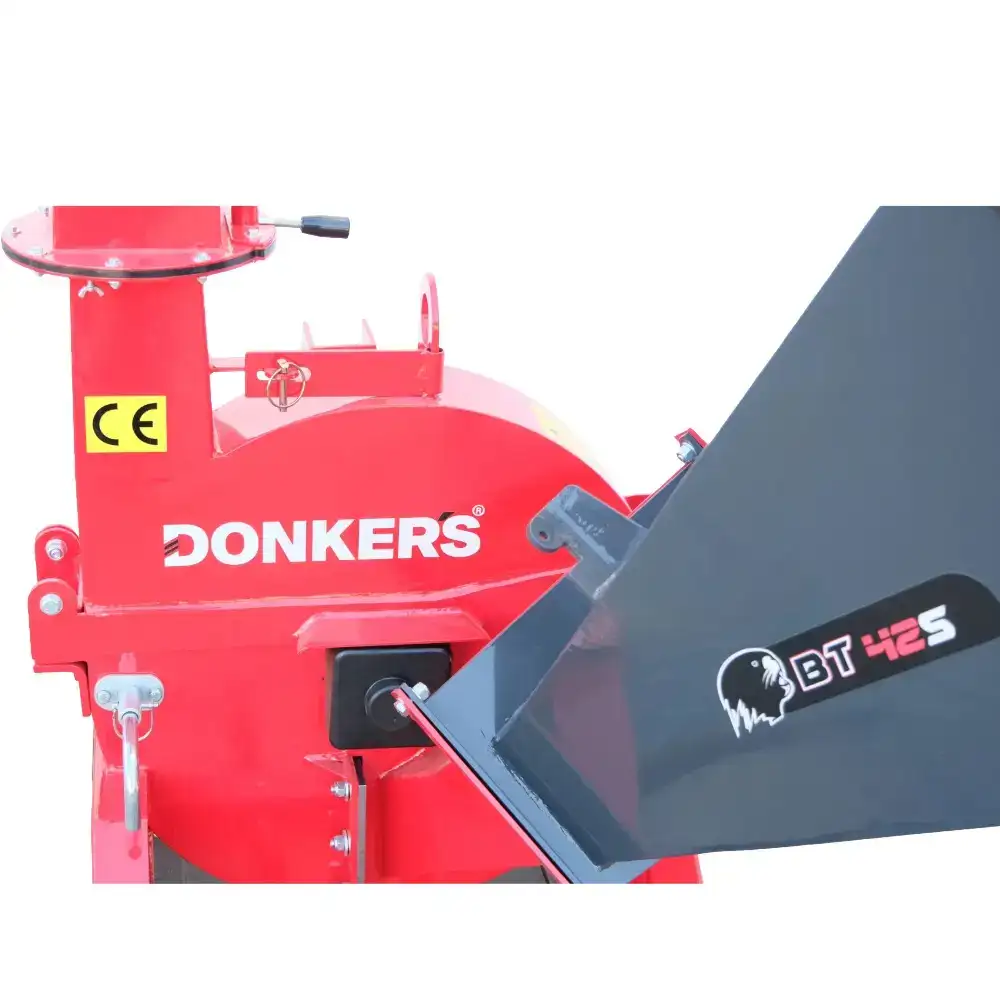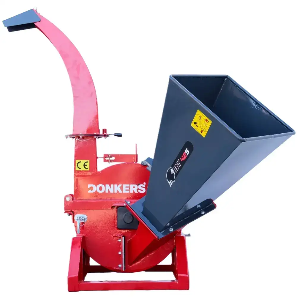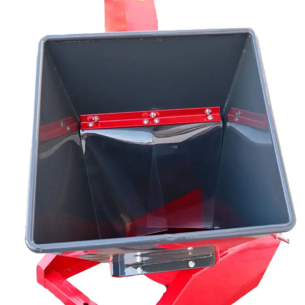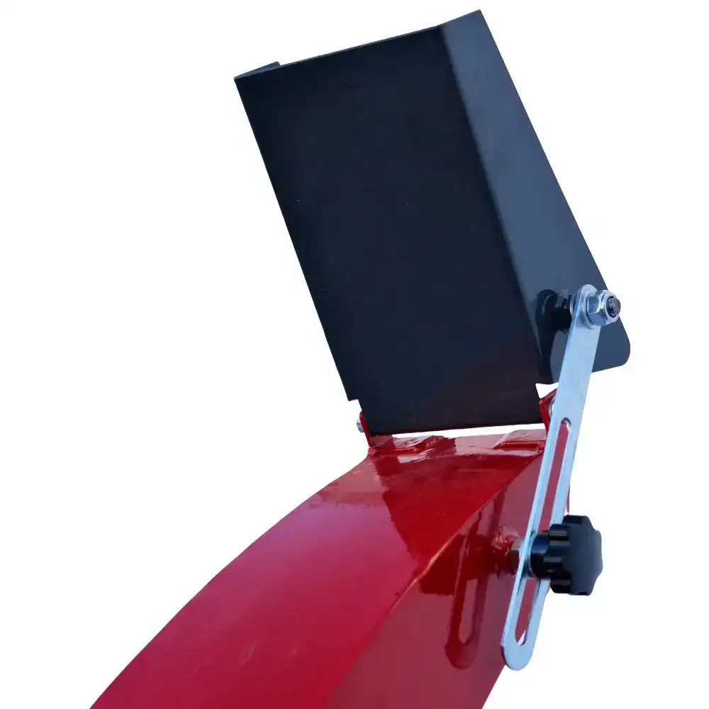 La estructura es de acero con espesores de 10 mm y 5 mm en las zonas de carga, y 2 mm en los componentes no estructurales, lo que garantiza una alta durabilidad. La tolva se puede plegar y asegurar con un pasador para facilitar su transporte. El tubo de descarga tiene 152 cm de altura, gira 360° y alcanza hasta 6 m, lo que permite redirigir fácilmente las astillas de madera para compostaje, mantillo, contenedores o remolques.