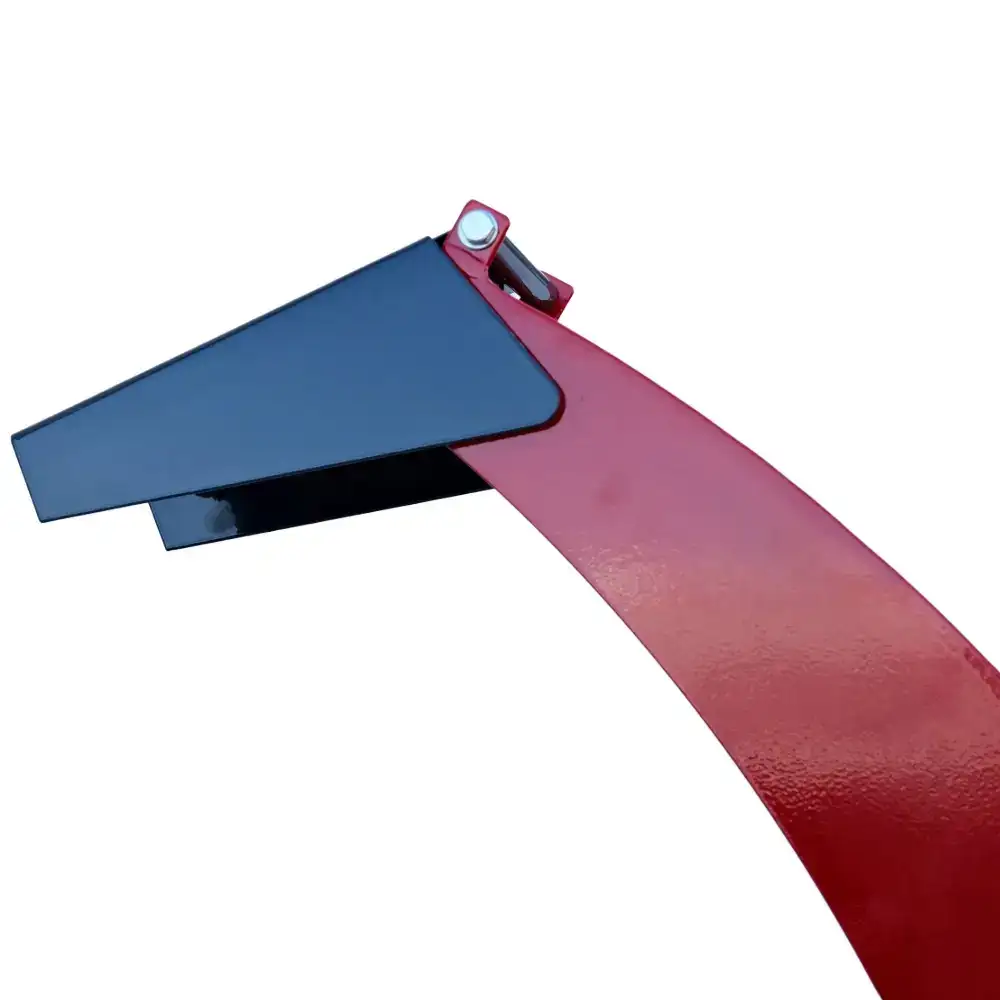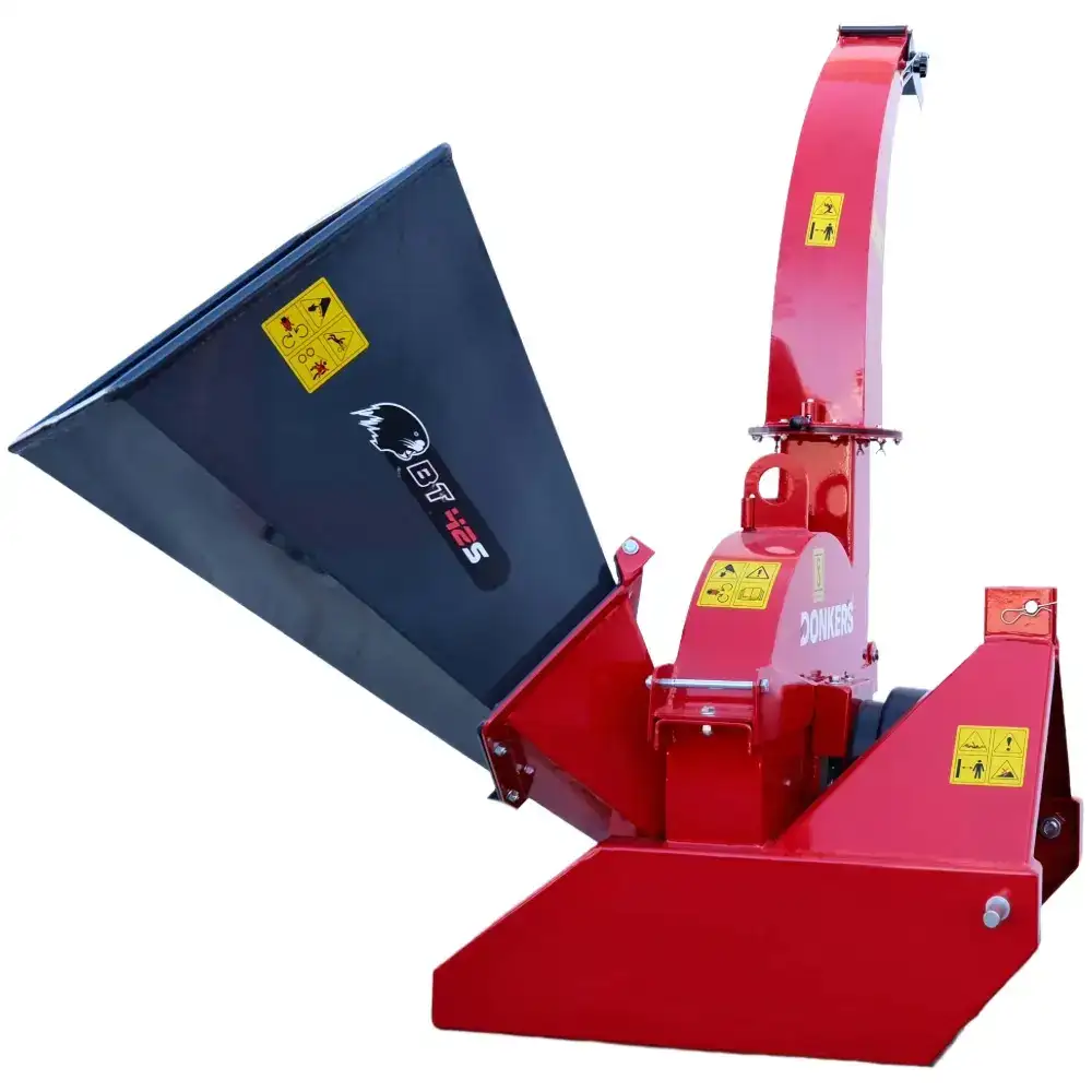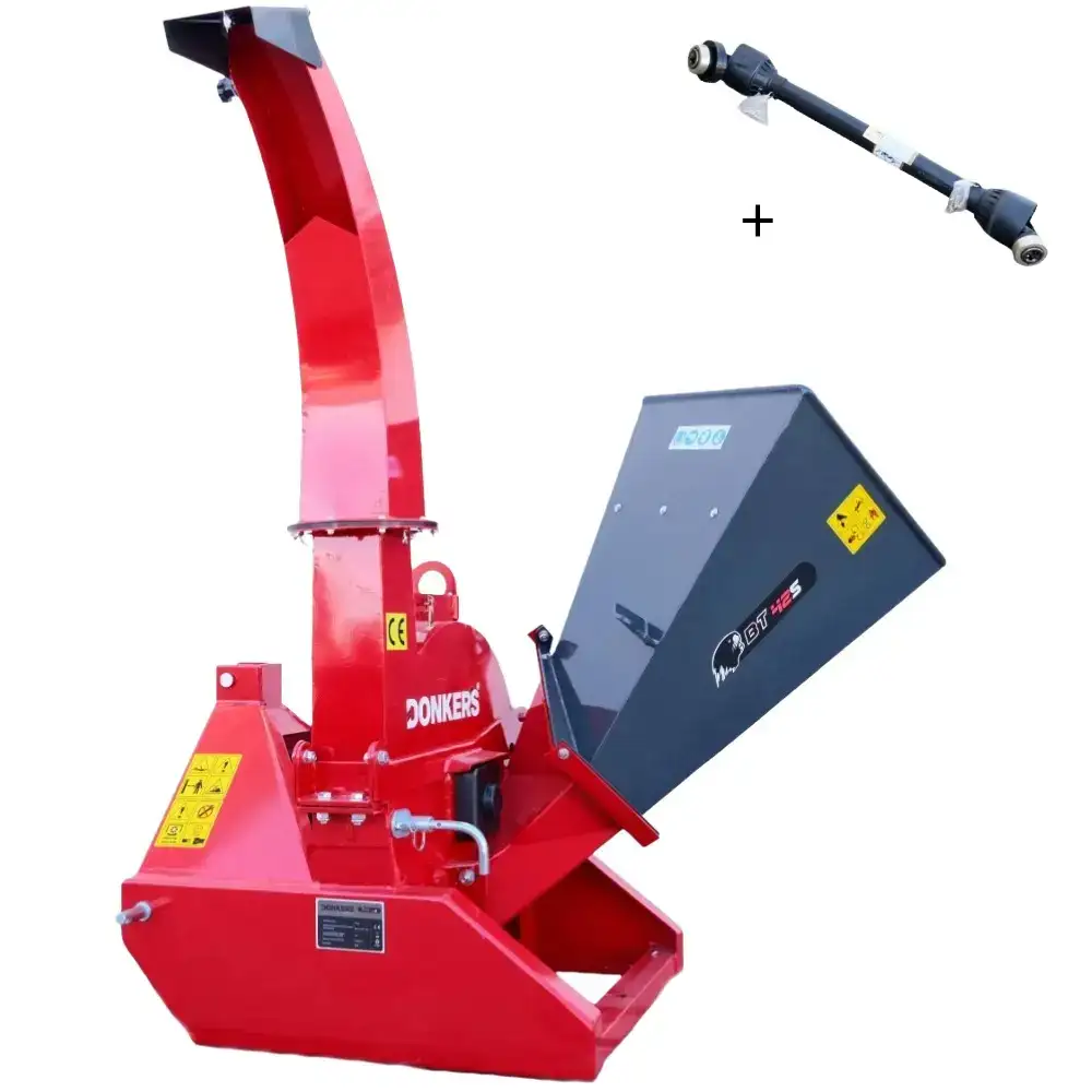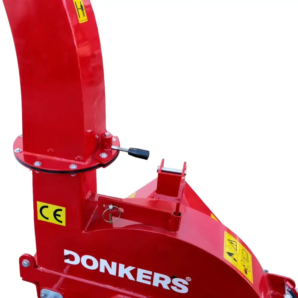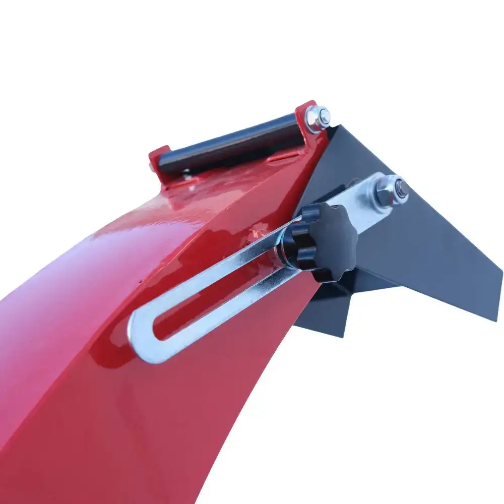 La estructura es de acero con espesores de 10 mm y 5 mm en las zonas de carga, y 2 mm en los componentes no estructurales, lo que garantiza una alta durabilidad. La tolva se puede plegar y asegurar con un pasador para facilitar su transporte. El tubo de descarga tiene 152 cm de altura, gira 360° y alcanza hasta 6 m, lo que permite redirigir fácilmente las astillas de madera para compostaje, mantillo, contenedores o remolques.