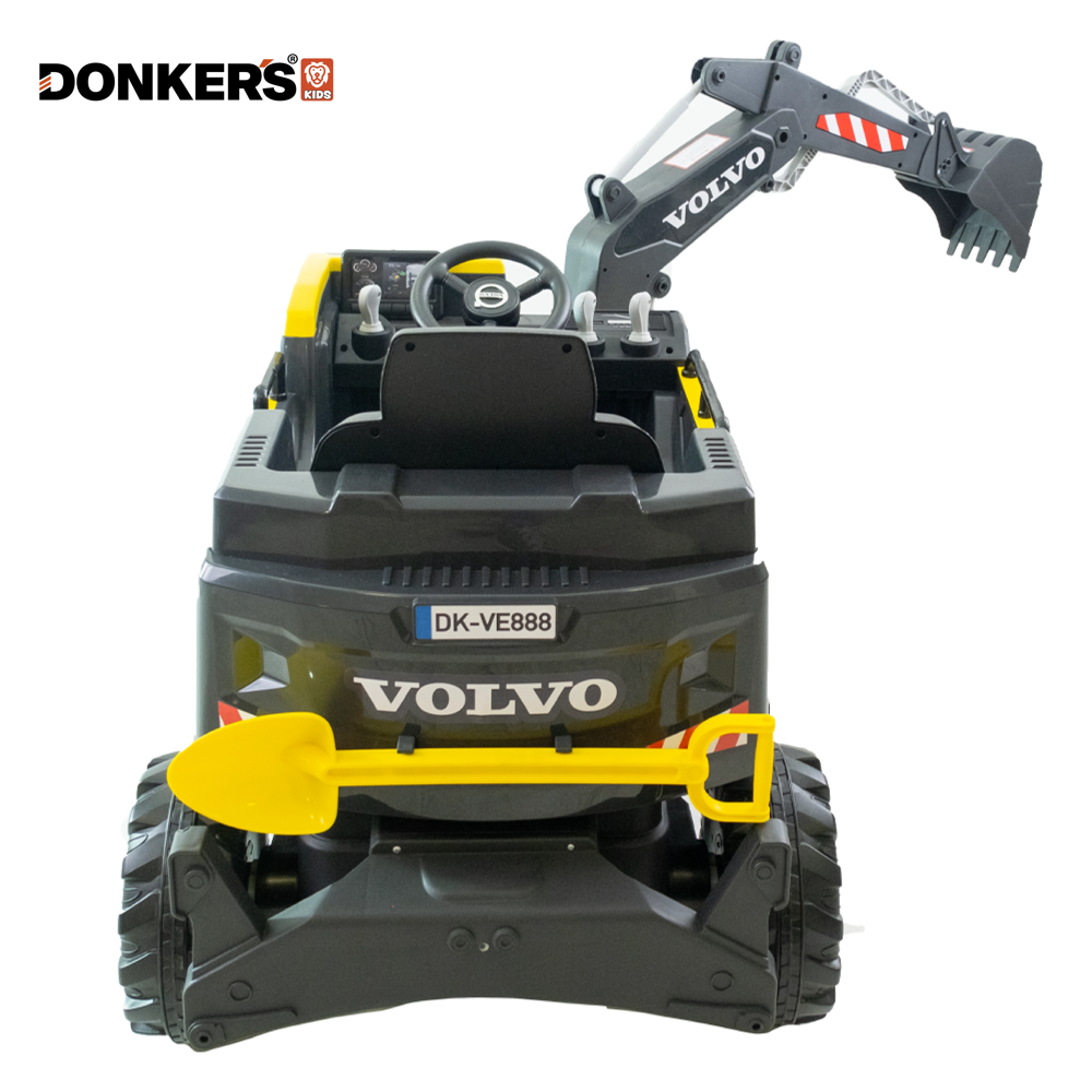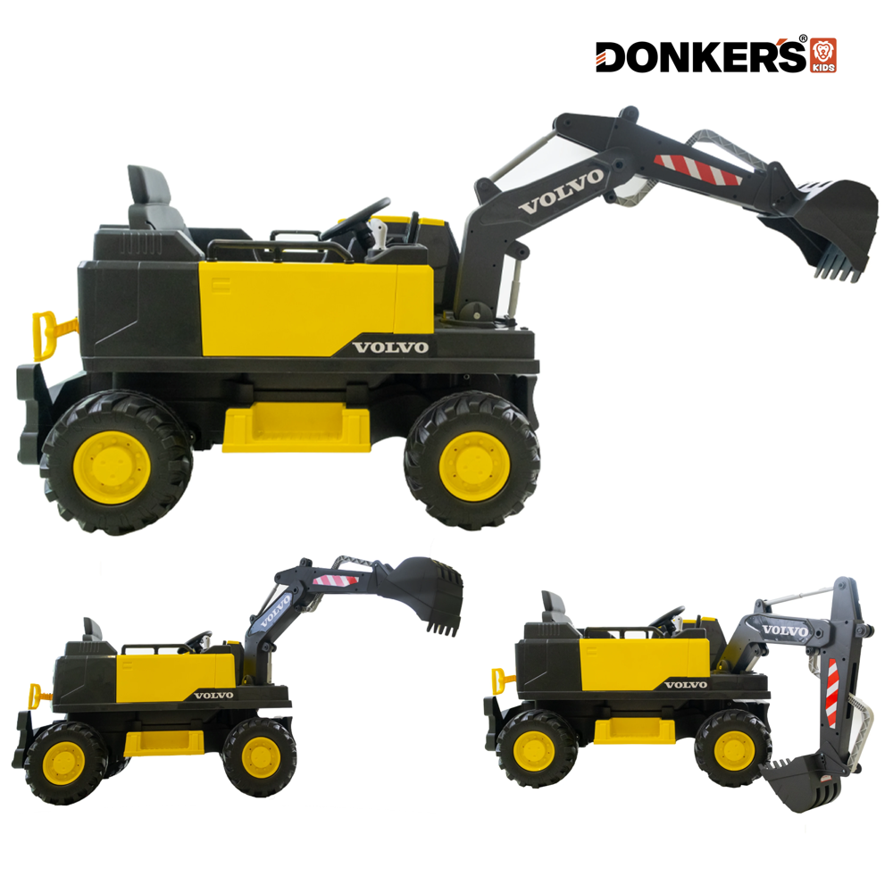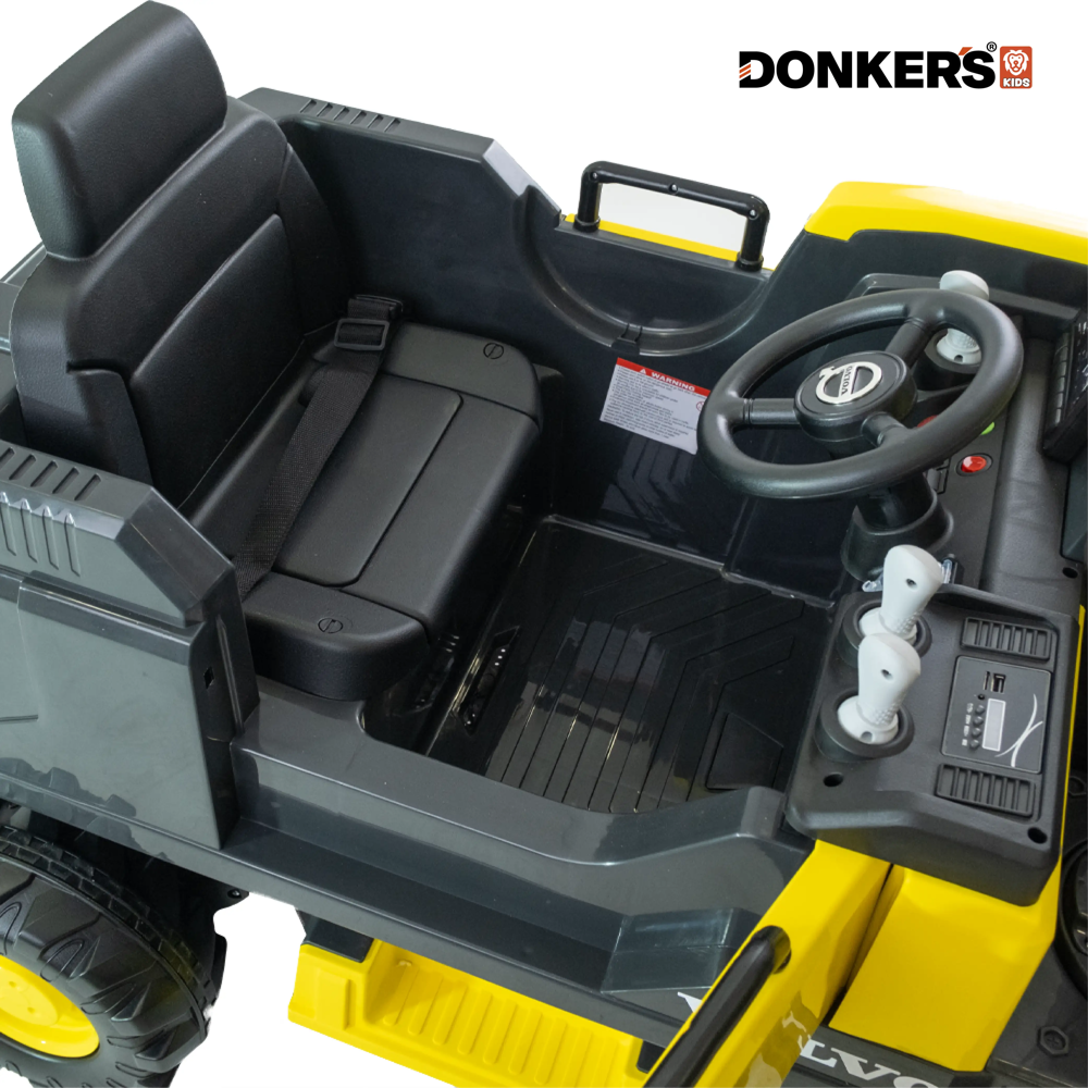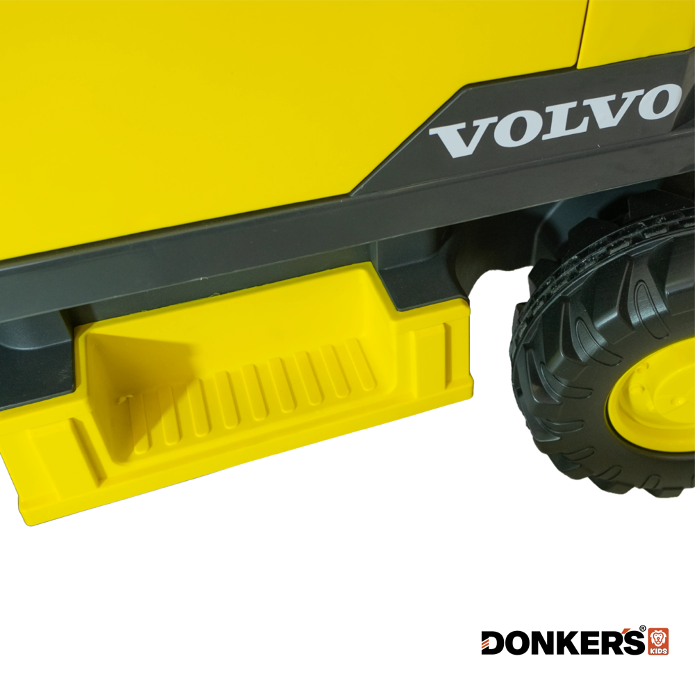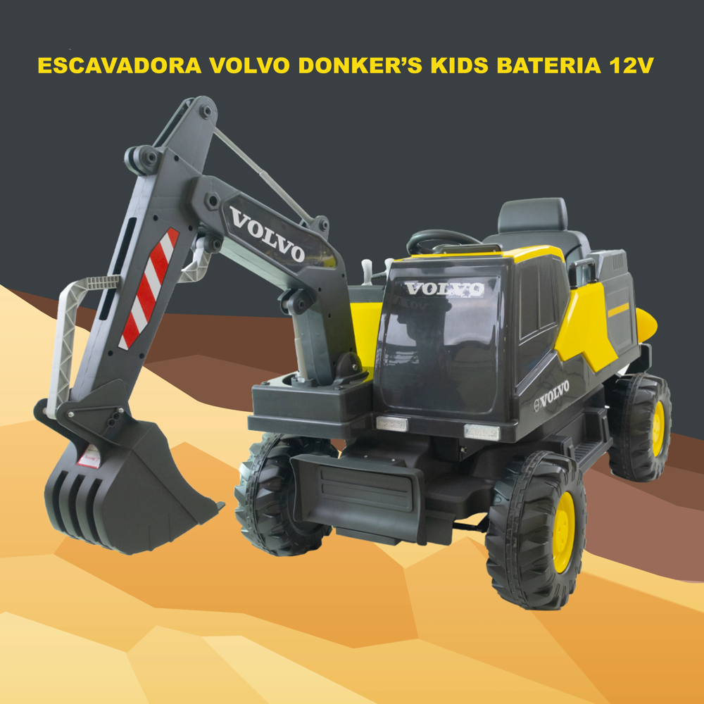 Escavadora Volvo Donker’s Kids com motor de 35W a bateria de 12V 10Ah para muitas horas de diversão sem fim.