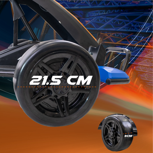 • O cinto de segurança é ajustável e a asa traseira proporciona equilíbrio e estabilidade, além de minimizar o arrasto do Kart em retas, melhorando a eficiência aerodinâmica.