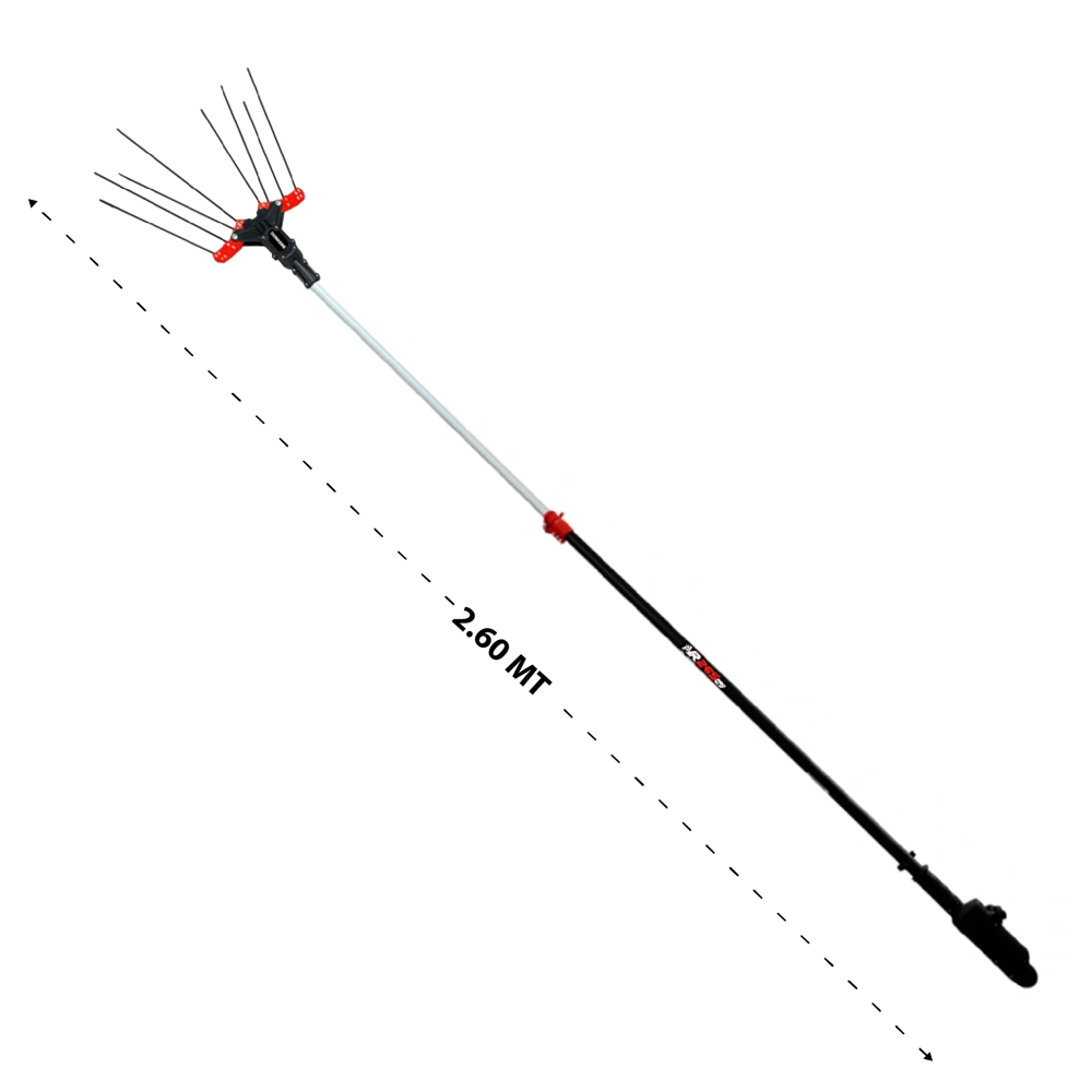 El equipo cuenta con 8 varillas, con una amplitud equivalente a un cabezal de 10 varillas, lo que garantiza una cobertura eficiente y ágil de las áreas cultivadas. Esto permite cosechar una cantidad significativa de aceitunas con mayor rapidez, optimizando el proceso y aumentando la productividad de la cosecha. Las varillas metálicas para el desplazamiento de las varillas hacen que el vareador de aceitunas VR265 PRO sea más resistente y duradero.