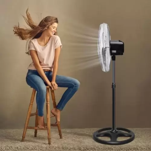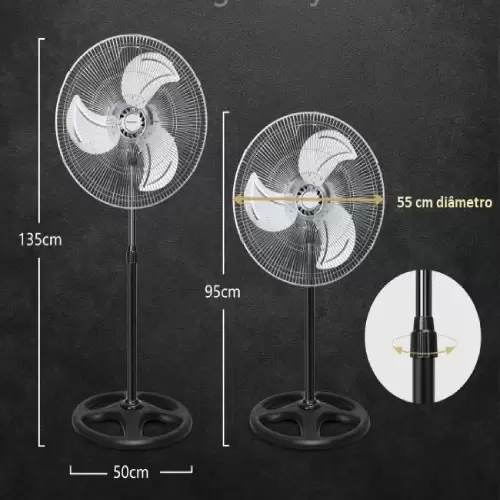 Ventilador portátil especialmente desenhado para mover grandes volumes de ar. O motor de cobre diminui o consumo de energia, trazendo uma brisa forte, com um nível baixo de ruído.